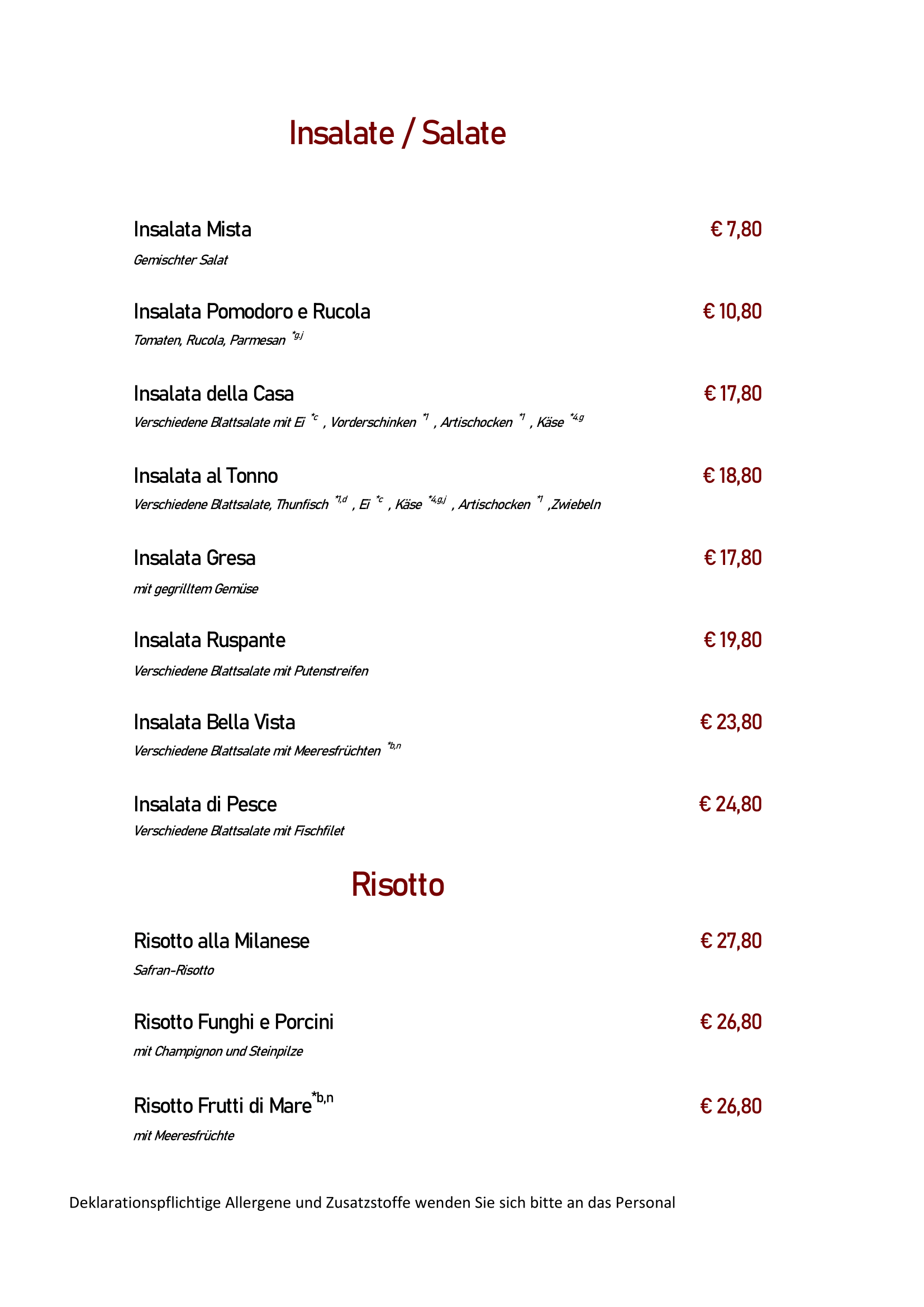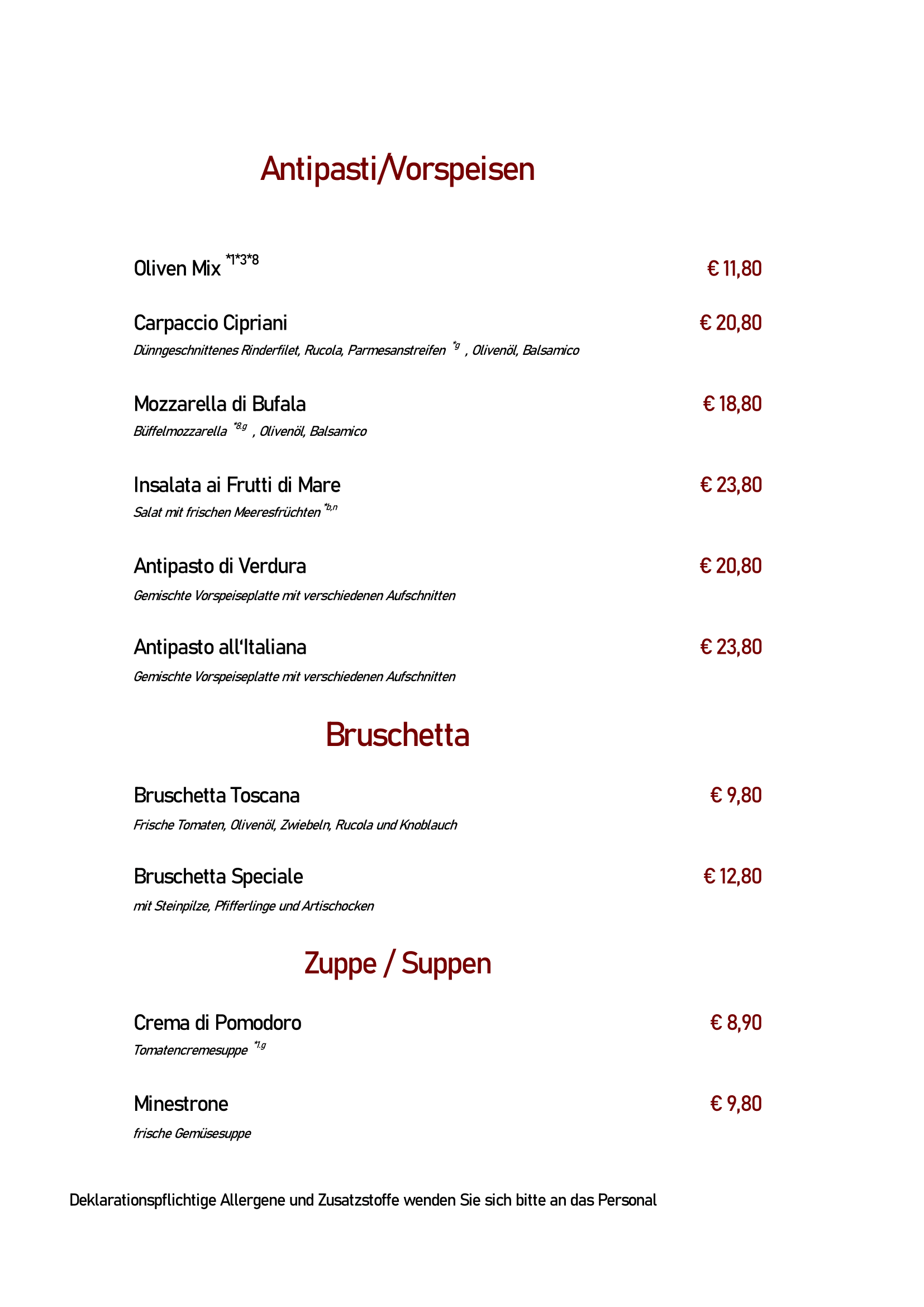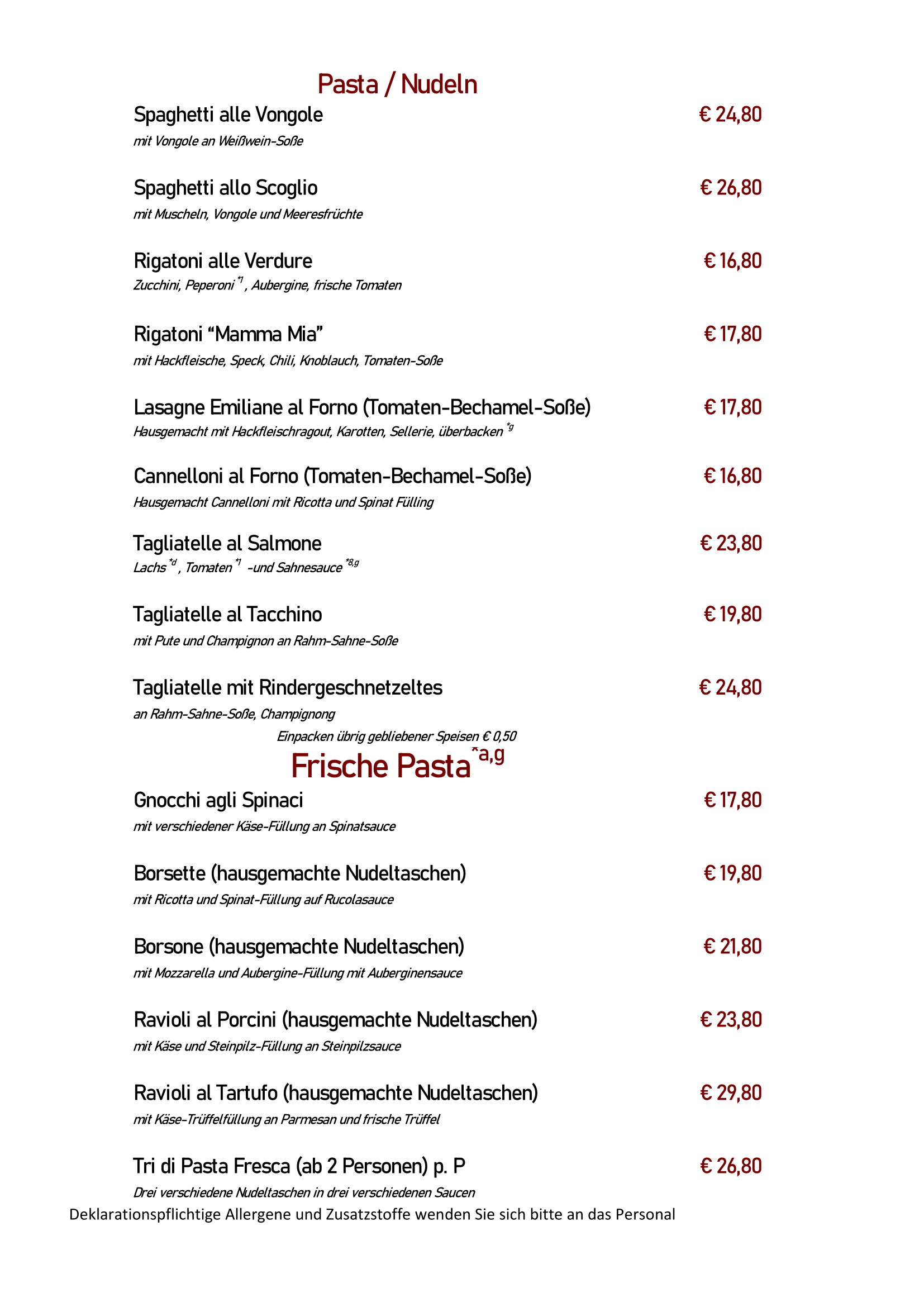 Entdecken Sie die Vielfalt der italienischen Küche in unserer Speisekarte. Jedes Gericht ist eine Hommage an die köstlichen Aromen Italiens – von handgemachter Pasta über knusprige Pizzen bis hin zu saisonalen Spezialitäten. Begleitet von ausgewählten Weinen bieten wir Ihnen Genussmomente, die Sie direkt nach Italien entführen.